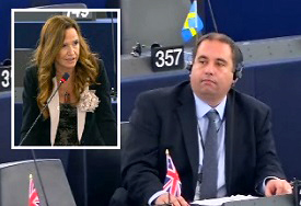 UKIP MEP Bill Etheridge bluecards Spanish MEP Teresa Jimenez during the debate on violence against women, Strasbourg, 25.11.2014