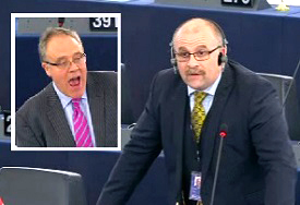 UKIP MEP James Carver bluecards Labour MEP Richard Howitt during the debate on Palestinian stateshood, Strasbourg, 26.11.2014