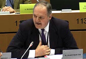 UKIP MEP William Dartmouth speaks during the INTA committee meeting with trade commissioner Malmstrom, 03.12.2014